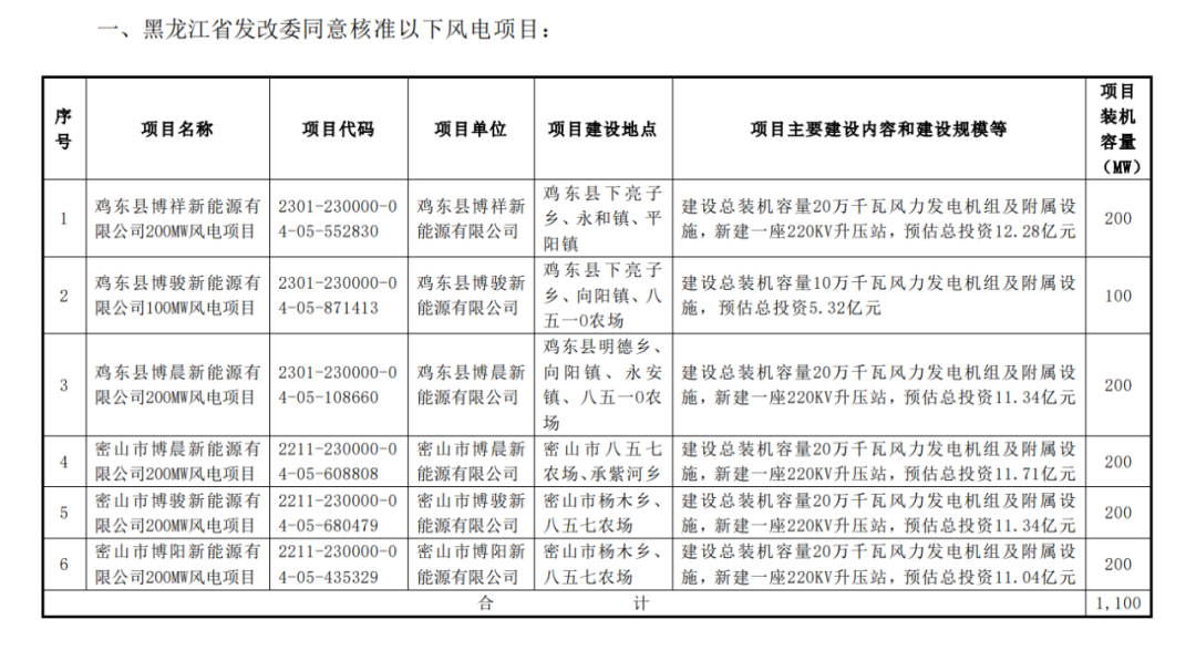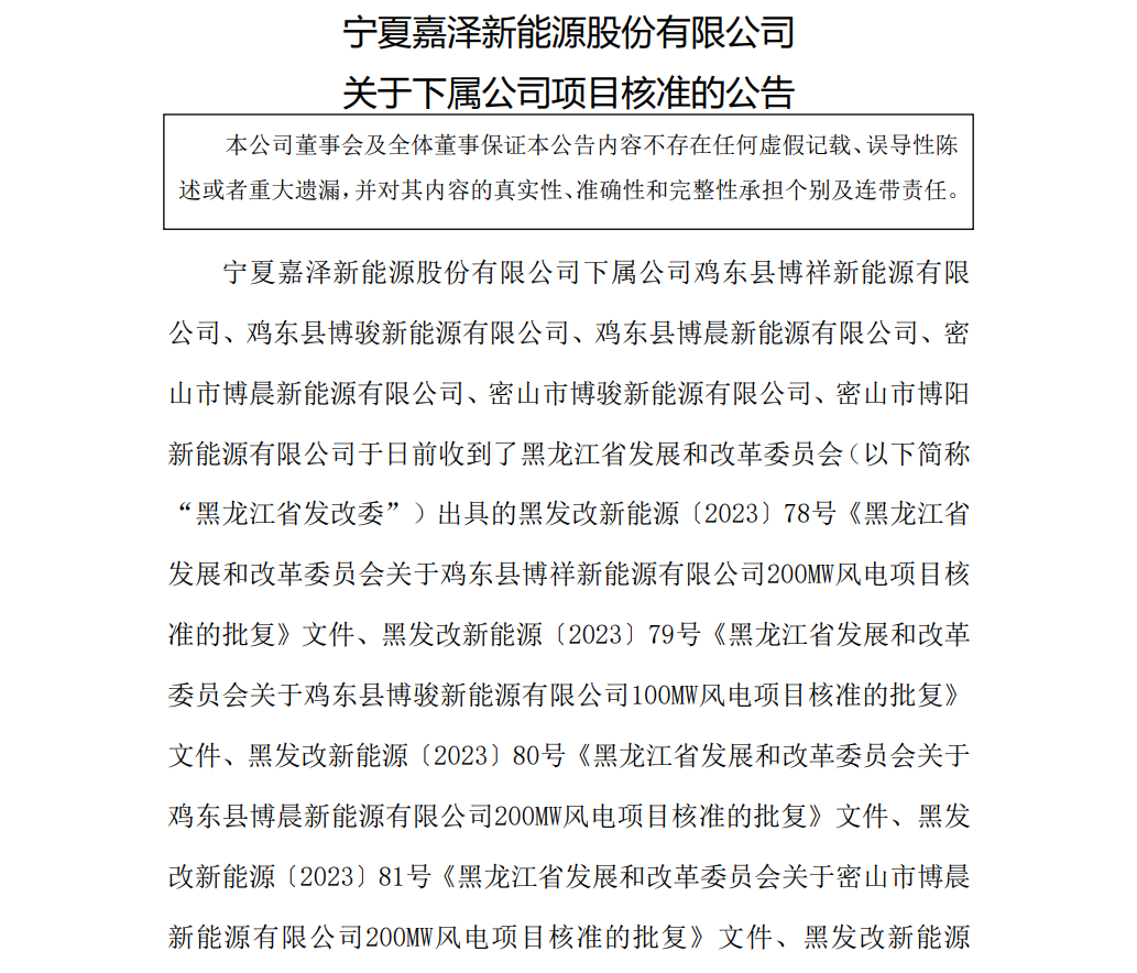 公告披露,寧夏嘉澤新能源股份有限公司下屬公司于日前收到了黑龍江省發(fā)展和改革委員會(huì)(以下簡(jiǎn)稱“黑龍江省發(fā)改委”)出具的風(fēng)電項(xiàng)目核準(zhǔn)的批復(fù)文件,共計(jì)六個(gè)風(fēng)電項(xiàng)目獲得核準(zhǔn),總裝機(jī)容量為1100MW。