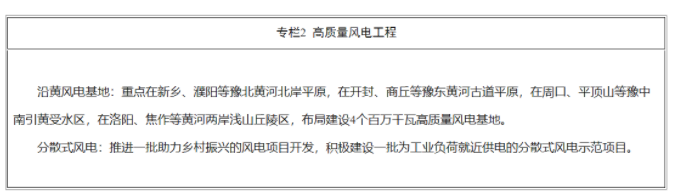 積極推進(jìn)集中式風(fēng)電規(guī)?;_(kāi)發(fā)。堅(jiān)持生態(tài)環(huán)境優(yōu)先,錨定新增靈活調(diào)節(jié)能力和用電負(fù)荷增長(zhǎng),根據(jù)風(fēng)能資源分布規(guī)律,加快風(fēng)能資源規(guī)?;_(kāi)發(fā)利用。在京廣鐵路以西及大別山區(qū)域優(yōu)先采用風(fēng)電與傳統(tǒng)電源、抽水蓄能電站一體化開(kāi)發(fā)模式,打造一批多能互補(bǔ)示范項(xiàng)目;在京廣鐵路以東平原區(qū)域,支持風(fēng)能就近開(kāi)發(fā)就地消納??茖W(xué)布局沿黃綠色能源廊道,做好水土保持、生態(tài)修復(fù)和林地恢復(fù),以沿黃淺山丘陵和中東部平原地區(qū)為重點(diǎn),加快建設(shè)4個(gè)百萬(wàn)千瓦高質(zhì)量風(fēng)電基地。