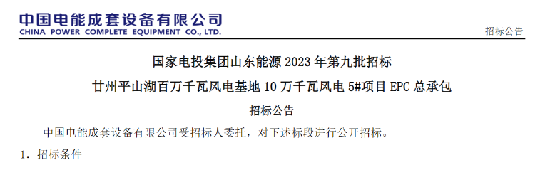 公告顯示,甘州平山湖百萬千瓦風電基地 10 萬千瓦風電 5#項目位于甘肅省張掖市甘州區(qū)平山湖蒙古族鄉(xiāng)境內(nèi),裝機容量 100MW,計劃安裝 10臺單機容量 5.5MW、 9 臺單機容量 5.0MW 的風電機組,新建 100MW 風電場、 110kV 升壓站、15MW/60MWh 儲能、新建約 5 公里 110kV 送出線路接入對側 330kV 匯集站。