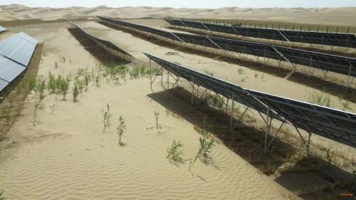 荒漠化一直是國(guó)家西部發(fā)展最大阻礙,西部治沙一直是國(guó)家的百年大計(jì),近年來,國(guó)家投注了大量精力和資金治沙,一直在不斷的探索治沙新模式。光伏治沙是二十一世紀(jì)第二個(gè)十年最新探索出的成果。中國(guó)電建集團(tuán)山東電建一公司德益公司積極擔(dān)當(dāng)作為,開展沙漠防沙固沙生態(tài)治理,在廠區(qū)迎風(fēng)面及光伏方陣,種植140萬平草方格,即用麥草、葦桿等材料在沙漠中扎成1米乘1米的正方形方格形狀,當(dāng)氣流或風(fēng)沙流經(jīng)沙障時(shí),產(chǎn)生渦旋并伴有積沙現(xiàn)象,經(jīng)過充分蝕積,形成較為光滑凹曲面,削弱風(fēng)沙的侵蝕,有效實(shí)現(xiàn)板上發(fā)電,板下治沙改土,減緩沙丘流動(dòng),減少水分蒸發(fā),為固沙植物存活創(chuàng)造良好條件。