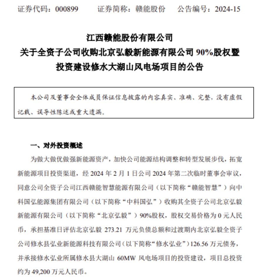 公告顯示,贛能股份全資子公司江西贛能智慧能源有限公司向中科國弘能源集團有限公司收購其全資子公司北京弘毅新能源有限公司90%股權,股權交易價格為0元人民幣,承擔基準日評估北京弘毅273.21萬元負債總額和過渡期內(nèi)北京弘毅全資子公司修水縣弘業(yè)新能源科技有限公司126.56萬元債務,并承接修水弘業(yè)所屬修水縣大湖山60MW風電場項目的投資建設,項目總投資約為4.92億元人民幣。