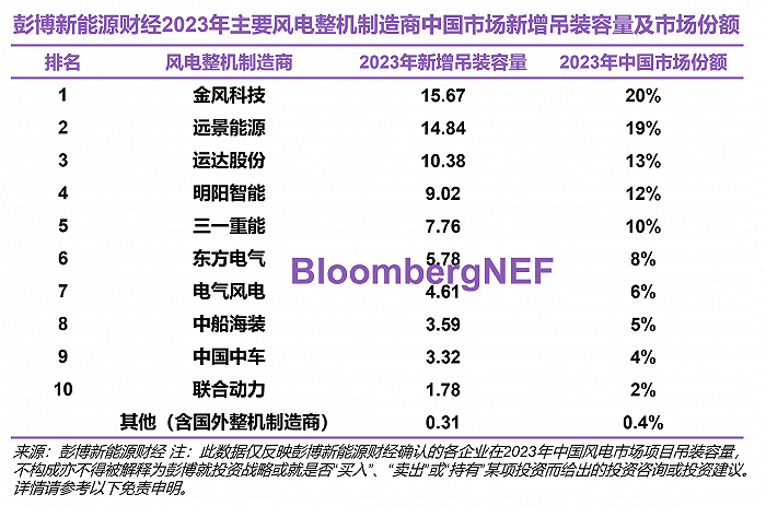 彭博新能源財(cái)經(jīng)稱,三一重能2023年的陸上風(fēng)電吊裝容量相較于2022年幾乎翻倍并位列第四,東方電氣實(shí)現(xiàn)了陸上風(fēng)電吊裝容量三倍增長(zhǎng),排名第五。