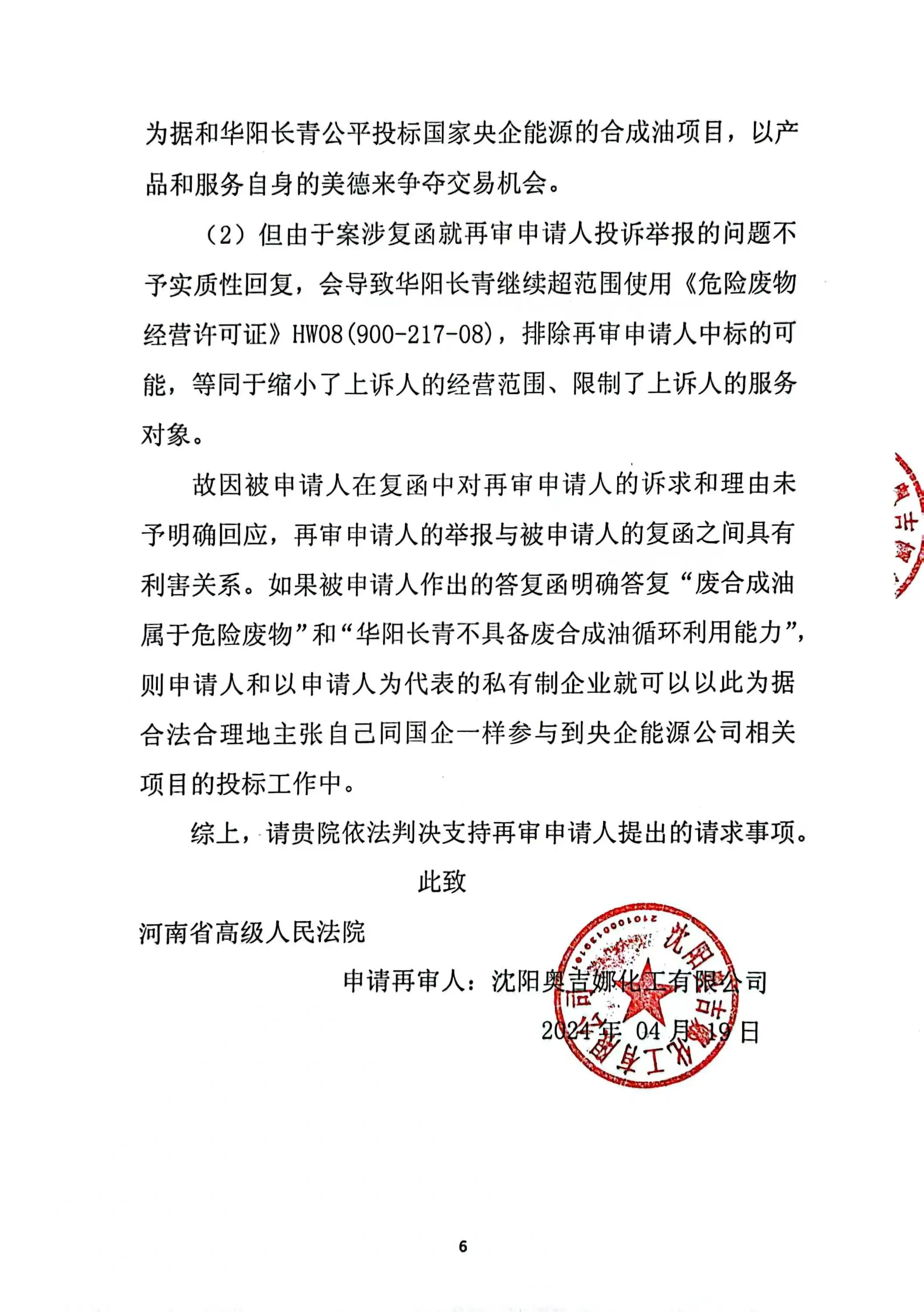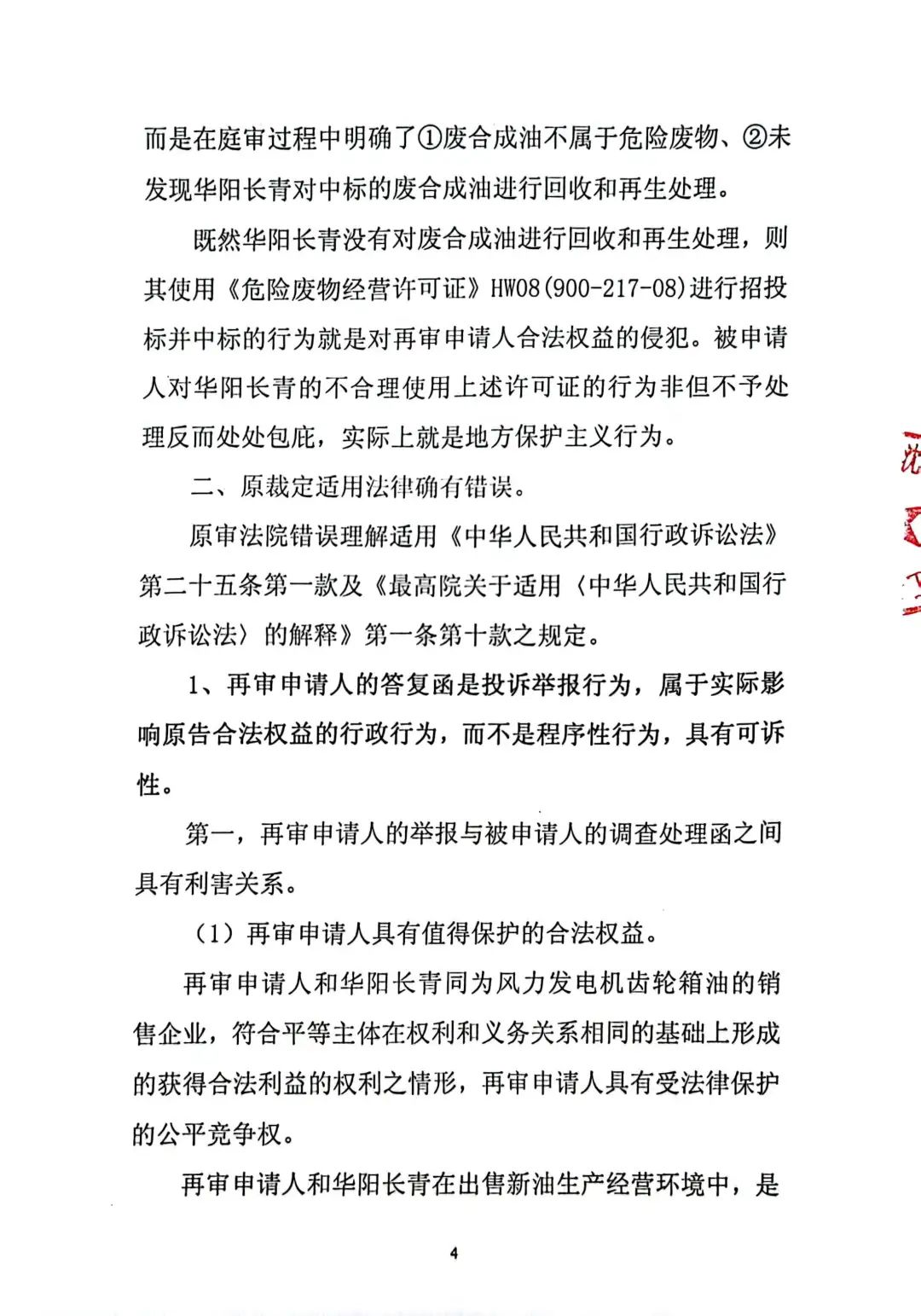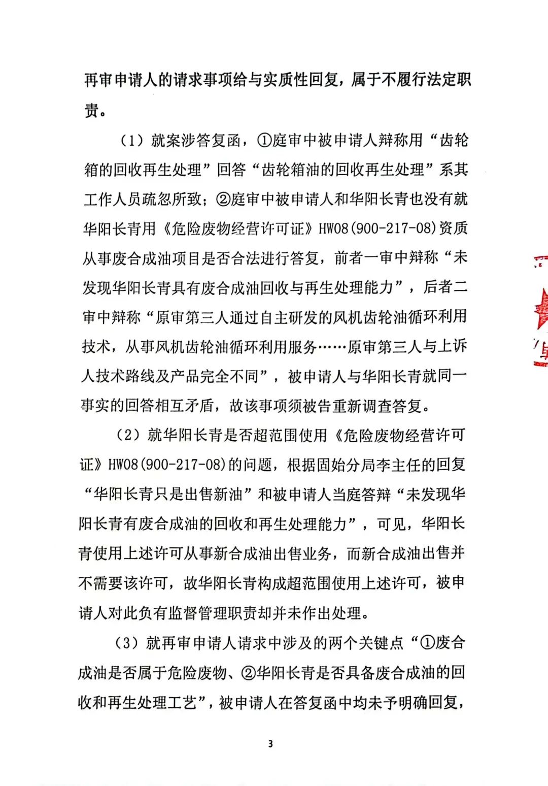奧吉娜公司在再審申請中再次要求對兩個關(guān)鍵問題進行法庭調(diào)查:1、《調(diào)查處理函》中的回答是錯誤的。信陽市生態(tài)環(huán)境局依據(jù)《國家危險廢物名錄(2021版)》認定廢合成油不屬于危險廢物,不需要《危險廢物許可證》這種回答是錯誤的,而且作為一個市級行政職能部門信陽市生態(tài)環(huán)境局也無權(quán)作出這種認定。2、根據(jù)奧吉娜公司對目前廢合成型風電潤滑油再生技術(shù)的了解,華陽長青公司不具備廢合成型風電潤滑油的再生能力,所謂的再生處理存在造假和欺騙的嫌疑!