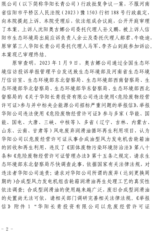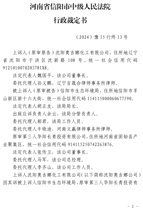 中國電力網(wǎng)訊 中國風電潤滑油龍頭企業(yè)沈陽奧吉娜化工有限公司(下簡稱:奧吉娜公司或上訴人)訴信陽市生態(tài)環(huán)境局(被上訴人)和第三人華陽長青投資有限公司(下簡稱:華陽長青公司)行政訴訟案,河南省信陽市中級人民法院于2024年4月2日作出二審行政裁定:駁回上訴,維護原裁定。