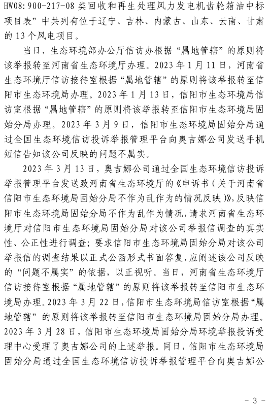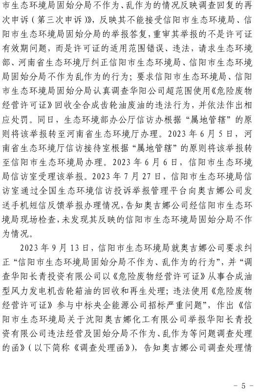 2023年3月9日,奧吉娜公司收到固始分局通過12369環(huán)境信訪平臺的短信答復(fù):“反映問題不屬實”。3月10日,奧吉娜公司向固始分局負責人電話詢問,其解釋稱:經(jīng)調(diào)查核實,華陽長青公司沒有再生風電潤滑油銷售,出售的是新油。否定了奧吉娜公司的舉報內(nèi)容。對此,奧吉娜公司表示強烈不滿。3月11日,奧吉娜公司向環(huán)境部投訴固始分局的不作為和亂作為。2023年5月26日,奧吉娜公司收到12369環(huán)境信訪平臺的短信答復(fù)。答復(fù)部門為信陽環(huán)境局。令人啼笑皆非的是,答復(fù)稱,華陽長青的許可證有效期沒有問題,與舉報內(nèi)容風馬牛不相及。2023年6月13日,奧吉娜公司再次向環(huán)境部提出申訴,指出,奧吉娜舉報的不是許可證有效期問題,而是許可證的適用范圍錯誤、違法。2023年7月27日,奧吉娜公司收到回復(fù)稱,經(jīng)信陽市生態(tài)環(huán)境局現(xiàn)場檢查,未發(fā)現(xiàn)固始分局不作為情況。2023年8月3日,奧吉娜公司向河南省生態(tài)環(huán)境廳(以下稱:環(huán)境廳)舉報信陽環(huán)境局包庇固始分局的行為。環(huán)境廳對此高度重視,有關(guān)處長和奧吉娜公司負責人進行了面談。2023年9月13日,信陽環(huán)境局向奧吉娜公司致《信陽市生態(tài)環(huán)境局關(guān)于沈陽奧吉娜化工有限公司舉報華陽長青投資有限公司違法經(jīng)營及固始分局不作為、亂作為等問題調(diào)查處理的函》。函中:一是,以“齒輪箱”替換“齒輪箱油”,偷換概念;二是,做出了廢風電合成(齒輪)油不屬于危險廢物的結(jié)論;三是,未發(fā)現(xiàn)固始分局存在不作為、亂作為的不當行為。再次否定奧吉娜公司的舉報和投訴。