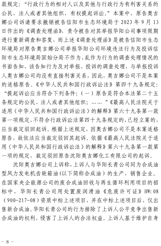 2、一審訴訟請求:請求人民法院判決撤銷被告作出的《信陽市生態(tài)環(huán)境局關(guān)于沈陽奧吉娜化工有限公司舉報華陽長青投資有限公司違法經(jīng)營及固始分局不作為、亂作為等問題調(diào)查處理的函》;責令被告對原告向被告舉報華陽長青投資有限公司事項,限期進行重新調(diào)查和答復(fù);判令被告認定的廢合成油不應(yīng)按危險廢物有關(guān)規(guī)定進行管理違反法律規(guī)章規(guī)定,無效。