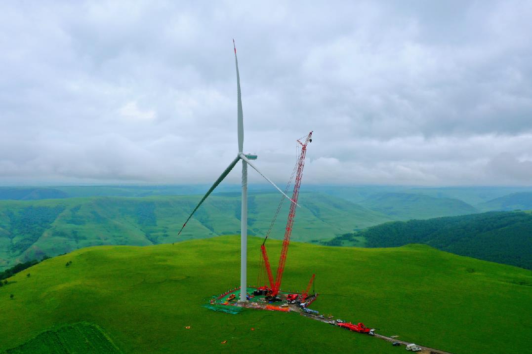8月6日,中國能建山西電建承建的全國首臺最大單機陸上風電機組——赤峰克旗興龍20萬千瓦風電項目首臺風機吊裝完成。