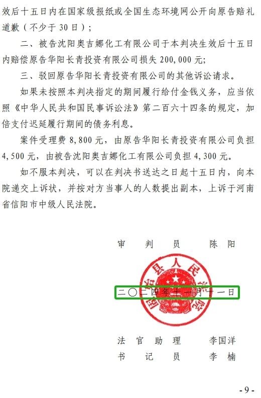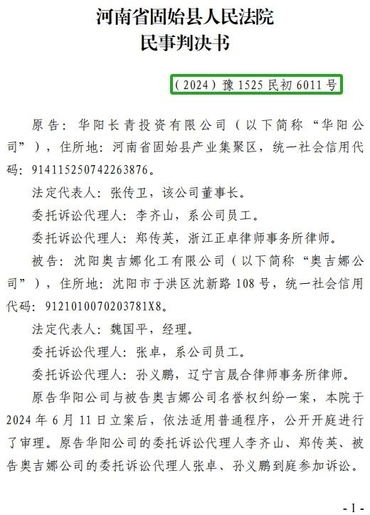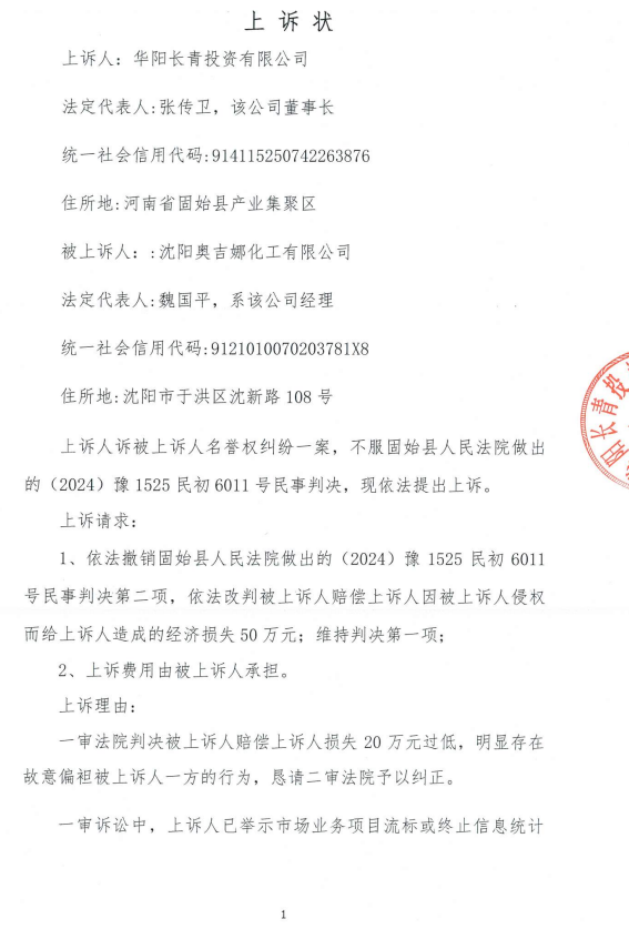 5、2024年10月30日,奧吉娜公司收到固始縣法院日期為2024年10月28日的《民事判決書(shū)》(2024)豫 1525 民初 6011 號(hào)。判決長(zhǎng)青公司勝訴如下:“一、被告沈陽(yáng)奧吉娜化工有限公司立即停止對(duì)原告華陽(yáng)長(zhǎng)青投資有限公司的舉報(bào)、投訴等名譽(yù)侵權(quán)行為,并于本判決生效后十五日內(nèi)在國(guó)家級(jí)報(bào)紙或全國(guó)生態(tài)環(huán)境網(wǎng)公開(kāi)向原告賠禮道歉(不少于 30 日); 二、被告沈陽(yáng)奧吉娜化工有限公司于本判決生效后十五日內(nèi)賠償原告華陽(yáng)長(zhǎng)青投資有限公司損失200,000 元; 三、駁回原告華陽(yáng)長(zhǎng)青投資有限公司的其他訴訟請(qǐng)求。 案件受理費(fèi)8,800元,由原告華陽(yáng)長(zhǎng)青投資有限公司負(fù)擔(dān)4,500元,由被告沈陽(yáng)奧吉娜化工有限公司負(fù)擔(dān)4,300元。”