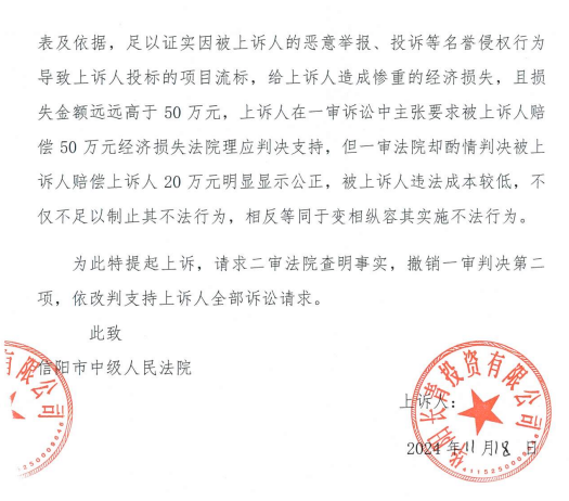 8、2024年11月18日,華陽(yáng)長(zhǎng)青公司提交《上訴狀》(依據(jù)第一個(gè)判決書(shū),上訴已超時(shí)),請(qǐng)求“1、依法撤銷(xiāo)固始縣人民法院做出的(2024)豫1525 民初 6011號(hào)民事判決第二項(xiàng),依法改判被上訴人賠償上訴人因被上訴人侵權(quán)而給上訴人造成的經(jīng)濟(jì)損失50萬(wàn)元;維持判決第一項(xiàng);2、上訴費(fèi)用由被上訴人承擔(dān)。”