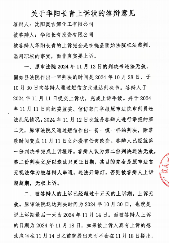 奧吉娜指證一審程序明目張膽嚴(yán)重違法、第二個(gè)判決書(shū)無(wú)效、華陽(yáng)長(zhǎng)青上訴無(wú)效