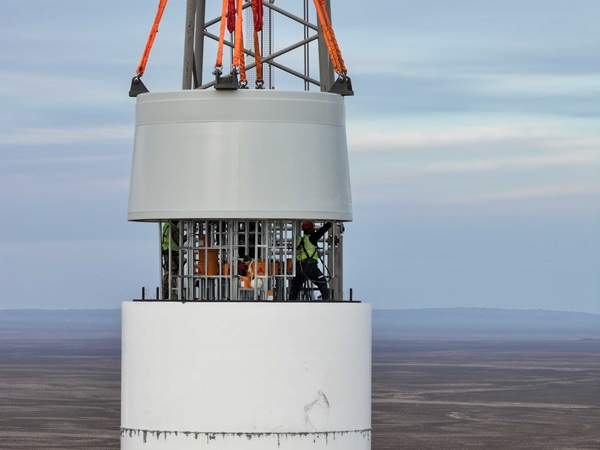 該首臺套風電機組并網(wǎng),標志著全球規(guī)?;逃米畲蠡焖L力發(fā)電機組在內(nèi)蒙古能源集團成功發(fā)電運行。項目使用的風電設備單機容量10兆瓦,混塔高134.4米,整機高度140米,葉片長112米,風輪直徑230米,覆蓋及掃風面積更大,經(jīng)濟性和發(fā)電量相對更高。值得一提的是,此項目風機塔筒由鋼筋混凝土中空、重力式基礎+上部高強混凝土預制管片疊合而成,是國內(nèi)首次采用內(nèi)張拉、預應力技術的10兆瓦混塔風力發(fā)電項目。塔筒內(nèi)部預留孔洞固定鋼纜,鋼纜固定后進行水泥灌漿填充縫隙,風機運行中旋轉產(chǎn)生擺動,使用此技術,在擺動時,塔筒內(nèi)部結構均勻受力,整體擺幅程度大大降低,使塔筒整體性更好、耐久性更強、預應力損失小,混塔結構塔筒優(yōu)勢突出。