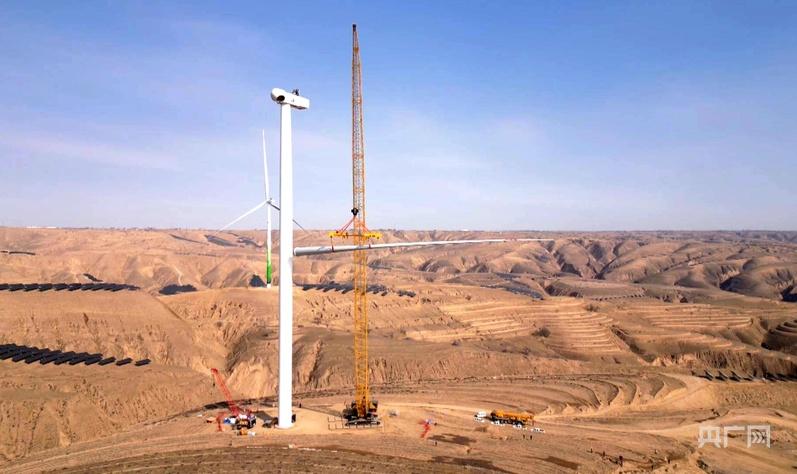 華能慶陽風(fēng)光綜合新能源示范項(xiàng)目二批D2風(fēng)光項(xiàng)目風(fēng)機(jī)吊裝現(xiàn)場(chǎng)(央廣網(wǎng)發(fā) 趙小強(qiáng) 攝)