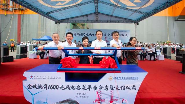 8月8日,新一代深遠海1600噸風(fēng)電安裝平臺“中天31”命名暨交付儀式在江蘇南通舉行。南通市委副書記、代市長張彤,陽江市委副書記、市長余金富,招商局工業(yè)集團黨委副書記、副總經(jīng)理吳四川,金風(fēng)科技集團董事長武鋼,中天科技集團董事長薛濟萍,以及三峽集團、國家電投集團、中廣核新能源公司等客戶代表出席儀式。
