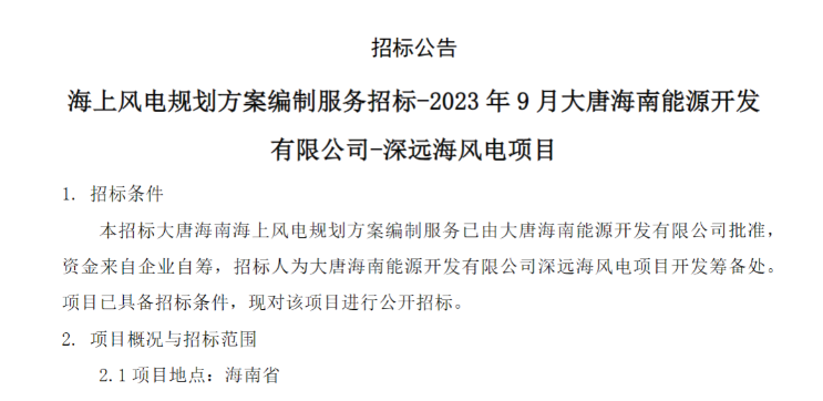 公告顯示,大唐海南能源開發(fā)有限公司按照中國大唐集團在瓊“4435”發(fā)展戰(zhàn)略、海南公司“3813”發(fā)展綱要,已完成成為海南省最大的清潔能源供應商。下一步,按照海南公司“一基兩翼三極+”發(fā)展新格局,將大力發(fā)展海上風電,根據海南公司海上風電發(fā)展需要,編制大唐海南海上風電基地規(guī)劃報告、海南省及東方市海上風電上下游產業(yè)鏈發(fā)展規(guī)劃報告。