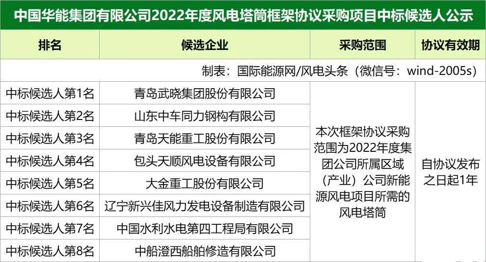 本網(wǎng)訊 近日,中國華能集團有限公司2022年度風(fēng)電塔筒框架協(xié)議采購項目中標候選人公示。