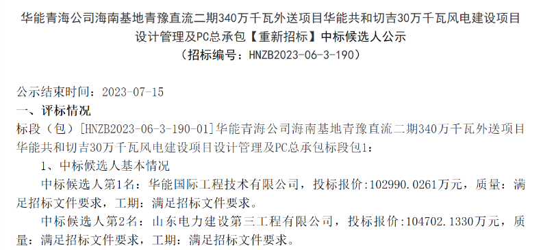 公告顯示,第一中標候選人:華能國際工程技術有限公司,投標報價:102990.0261萬元。第二中標候選人:山東電力建設第三工程有限公司,投標報價:104702.1330萬元。第三中標候選人:中國電建集團山東電力建設第一工程有限公司,投標報價:109934.0179萬元。