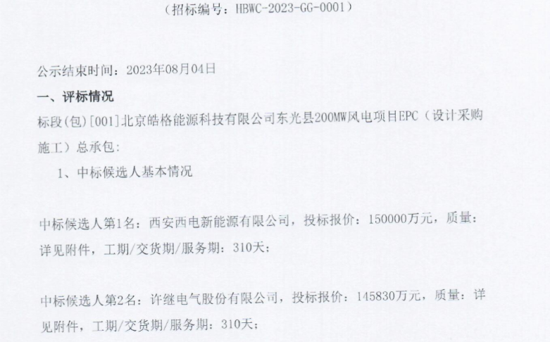 公告顯示,第一中標候選人:西安西電新能源有限公司,投標報價: 150000萬元。第二中標候選人:許繼電氣股份有限公司,投標報價: 145830萬元。第三中標候選人:中國能源建設(shè)集團陜西省電力設(shè)計院有限公司,投標報價:155492萬元。