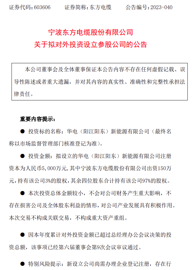 12月2日,東方電纜發(fā)布關(guān)于擬對(duì)外投資設(shè)立參股公司的公告。根據(jù)公告顯示,華電新能源集團(tuán)股份有限公司、廣東金風(fēng)科技有限公司、寧波東方電纜股份有限公司、中國水利水電第四工程局有限公司、海南程邦投資控股有限公司 五方共同出資在廣東省陽江市成立合資公司負(fù)責(zé)廣東華電陽江三山島六50萬千瓦海上風(fēng)電項(xiàng)目投資、建設(shè)、 運(yùn)營。