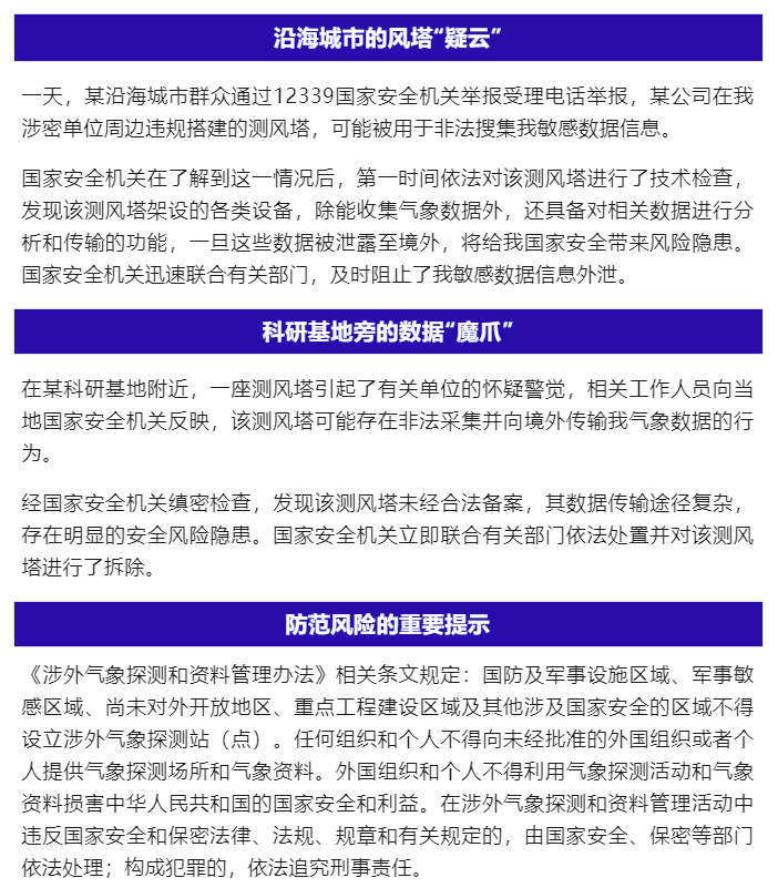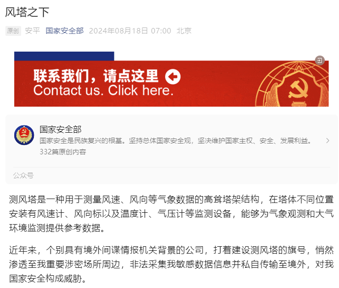 8月18日,據(jù)國家安全部官微消息,近年來,個別具有境外間諜情報機關(guān)背景的公司,打著建設(shè)風電測風塔的旗號,悄然滲透至我重要涉密場所周邊,非法采集我敏感數(shù)據(jù)信息并私自傳輸至境外,對我國家安全構(gòu)成威脅。