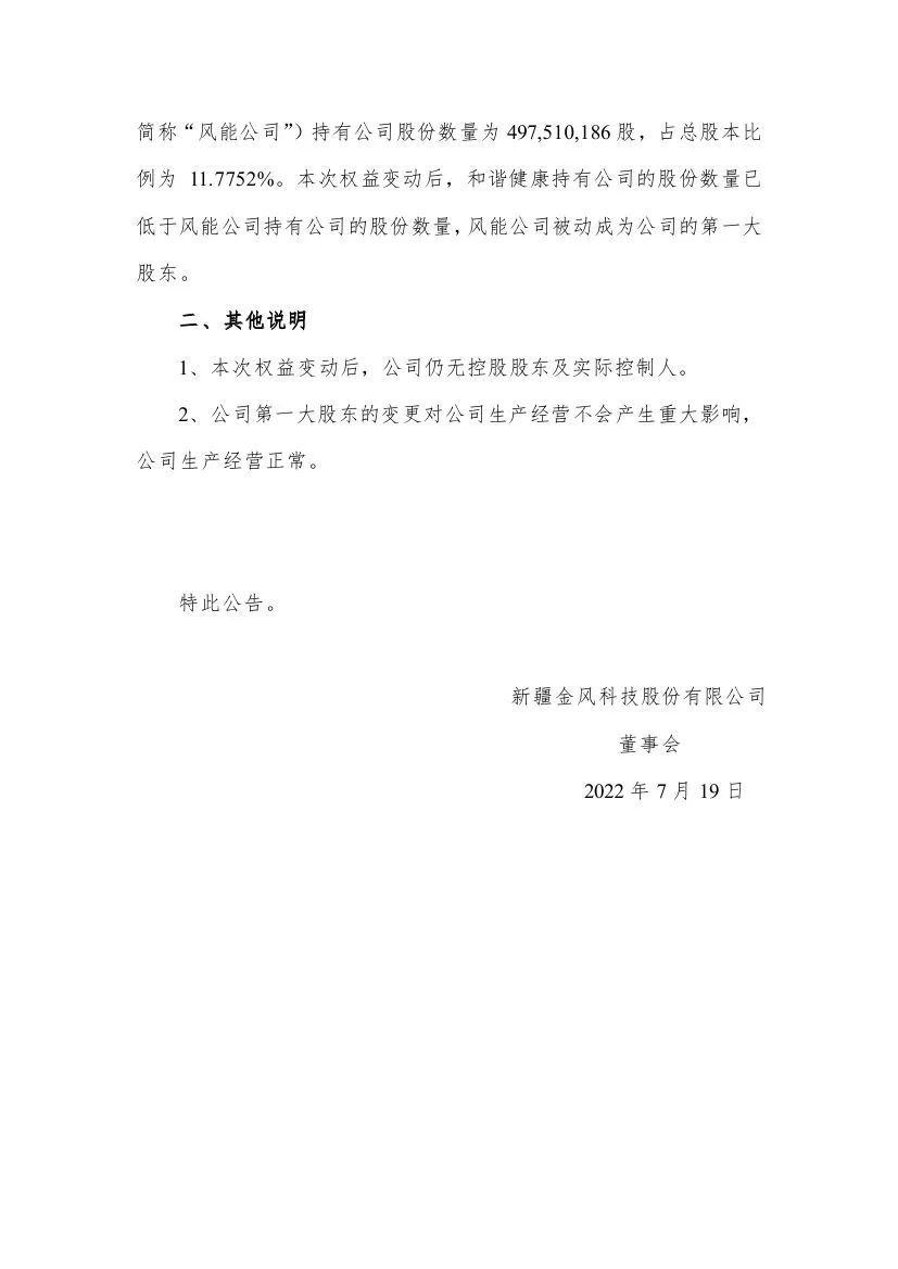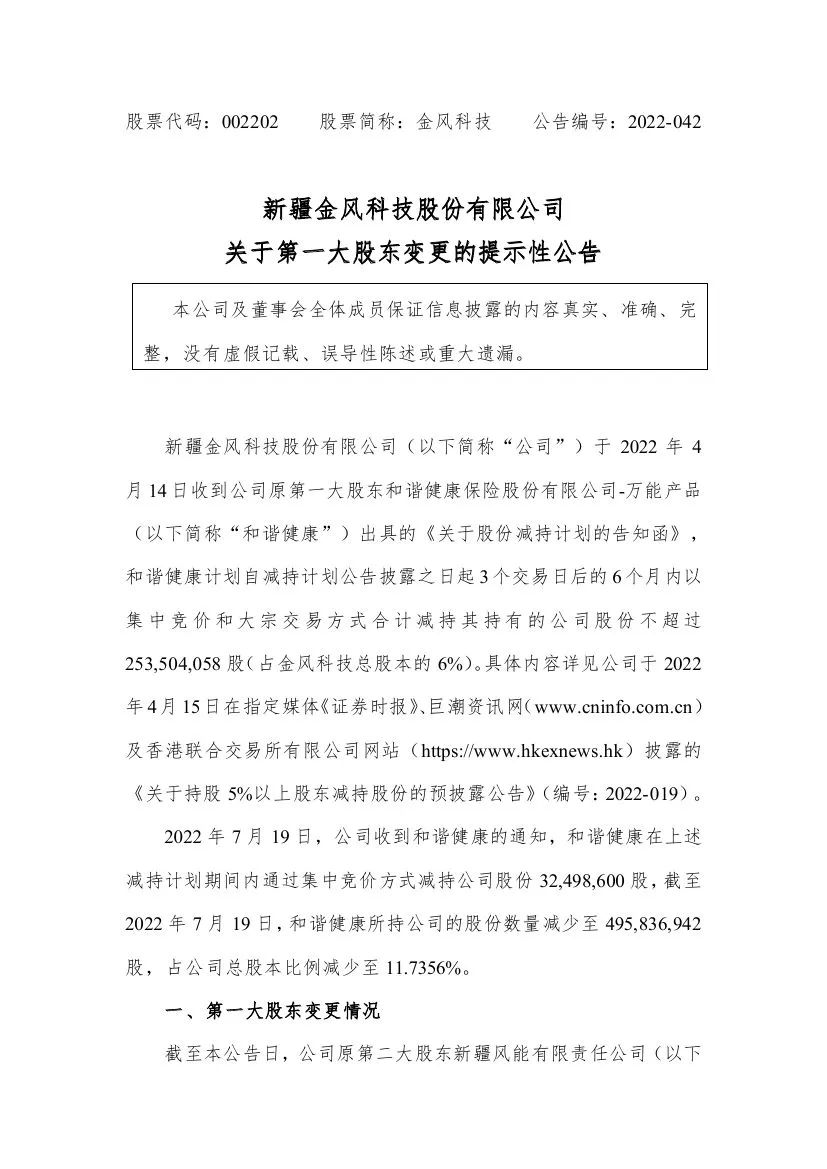 金風(fēng)科技日前發(fā)布《關(guān)于第一大股東變更的提示性公告》。截至2022年7月19日,公司原第一大股東和諧健康保險股份有限公司-萬能產(chǎn)品(簡稱“和諧健康”)所持公司的股份數(shù)量占總股本比例減少至11.7356%,原第二大股東新疆風(fēng)能有限責(zé)任公司(簡稱“風(fēng)能公司”)被動成為公司的第一大股東。