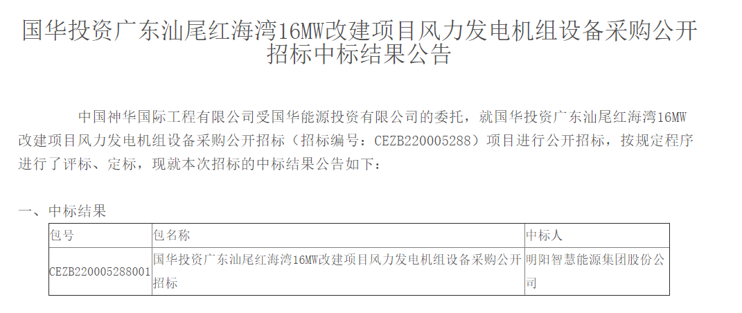日前,國華投資廣東汕尾紅海灣16MW改建項目風力發(fā)電機組設(shè)備采購公開招標結(jié)果,明陽智能成功中標;國華投資國華(汕尾)風電有限公司紅海灣風電場項目EPC總承包工程公開招標結(jié)果,明陽智能旗下潤陽能源技術(shù)有限公司(簡稱:潤陽能源)全資子公司天津明智潤陽技術(shù)有限公司成功中標。