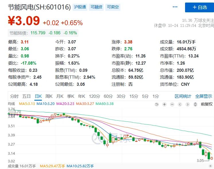 二級市場上,截至24日午間收盤,節(jié)能風(fēng)電上漲0.65%,報3.09元/股。