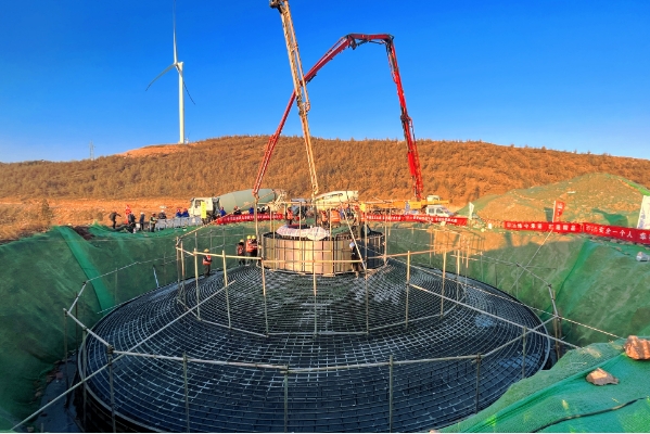在河南省嵩縣項(xiàng)目建設(shè)現(xiàn)場(chǎng),一派熱火朝天的施工景象。嚴(yán)寒天氣中,中國(guó)節(jié)能首個(gè)產(chǎn)業(yè)助力鄉(xiāng)村振興重點(diǎn)項(xiàng)目——中節(jié)能嵩縣九皋鎮(zhèn)風(fēng)電場(chǎng)項(xiàng)目工程現(xiàn)場(chǎng)塔吊林立,運(yùn)輸車(chē)輛往來(lái)穿梭,基礎(chǔ)澆筑井然有序,以一個(gè)個(gè)風(fēng)機(jī)基礎(chǔ)構(gòu)成的“同心圓”應(yīng)了農(nóng)歷新年“和美團(tuán)圓”之意。