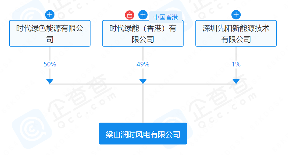 從企查查獲悉,近日,梁山潤時(shí)風(fēng)電有限公司成立,注冊資本1000萬元人民幣。新公司由深圳先陽新能源技術(shù)有限公司(1%)、時(shí)代綠能(香港)有限公司(49%)以及寧德時(shí)代旗下時(shí)代綠色能源有限公司(50%)共同持股。