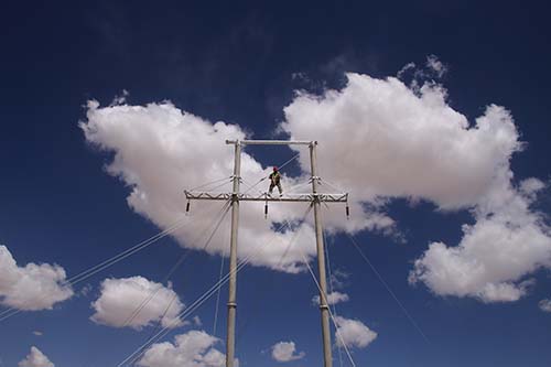 項(xiàng)目架空線路桿塔共計668基,12種桿塔型式。桿塔是在35kV架空線路架設(shè),線路總長度約122.21km,塔高為15-21米,屬于高空作業(yè)。施工現(xiàn)場干旱炎熱,沙塵暴和冰雹也常常輪番“光顧”,給施工進(jìn)度和安全管理帶來不小的挑戰(zhàn)。在桿塔組立作業(yè)前,項(xiàng)目部組織協(xié)作隊(duì)伍召開專題安全會,施工隊(duì)長徐少帥堅持對現(xiàn)場的施工操作人員進(jìn)行詳細(xì)的安全、技術(shù)、質(zhì)量交底工作;質(zhì)量安全科林周彬堅持每天現(xiàn)場巡查,要求高空作業(yè)人員必須持證上崗,且具有合格的體檢報告;施工過程中,施工現(xiàn)場拉起安全警戒線、懸掛安全警示標(biāo)識,安全員全程旁站監(jiān)督,確保現(xiàn)場施工安全質(zhì)量可控。