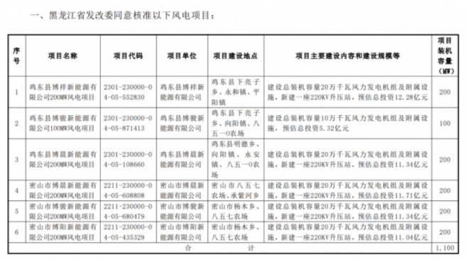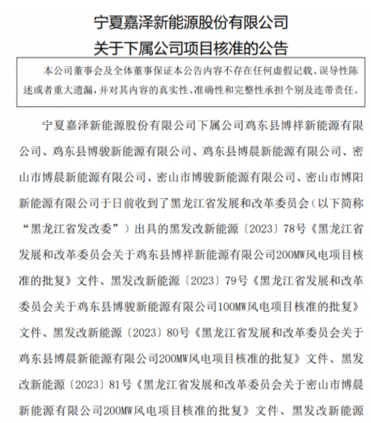公告披露,寧夏嘉澤新能源股份有限公司下屬公司于日前收到了黑龍江省發(fā)展和改革委員會(以下簡稱“黑龍江省發(fā)改委”)出具的風(fēng)電項目核準的批復(fù)文件,共計六個風(fēng)電項目獲得核準,總裝機容量為1100MW。