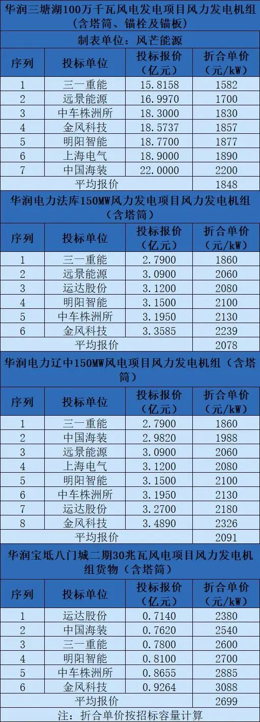 10月11日,華潤(rùn)4個(gè)風(fēng)機(jī)采購(gòu)項(xiàng)目共計(jì)1.33GW開標(biāo)。其中,華潤(rùn)三塘湖1GW風(fēng)機(jī)(含塔筒、錨栓)采購(gòu)項(xiàng)目共有7家整機(jī)商競(jìng)標(biāo),最高投標(biāo)報(bào)價(jià)22億元,折合單位2200元/kW;最低投標(biāo)報(bào)價(jià)為15.8158億元,折合單價(jià)為1582元/kW。減去塔筒、錨栓價(jià)格(按輕量化,保守350元/kW來(lái)算),最低報(bào)價(jià)裸機(jī)價(jià)格僅約1232元/kW。該報(bào)價(jià)為風(fēng)機(jī)價(jià)格歷史最低點(diǎn)。