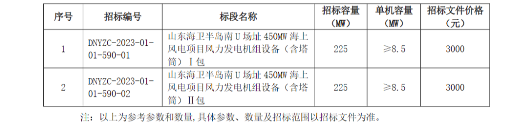 此次招標共劃分為2個標段,招標包I、包II標段供貨范圍為總裝機規(guī)模 450MW、單臺機組容量 8.5MW及以上的海上風力發(fā)電機組設(shè)備(整個項目可上浮小于 1臺單機容量)及塔筒和配套服務(wù),具體供貨及服務(wù)范圍包括但不限于: