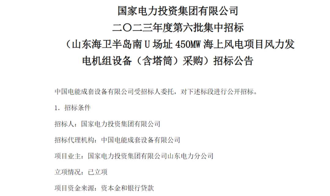 近日,國家電投發(fā)布《國家電力投資集團有限公司二〇二三年度第六批集中招標(山東海衛(wèi)半島南 U場址 450MW海上風電項目風力發(fā)電機組設(shè)備(含塔筒)采購)招標公告》。
