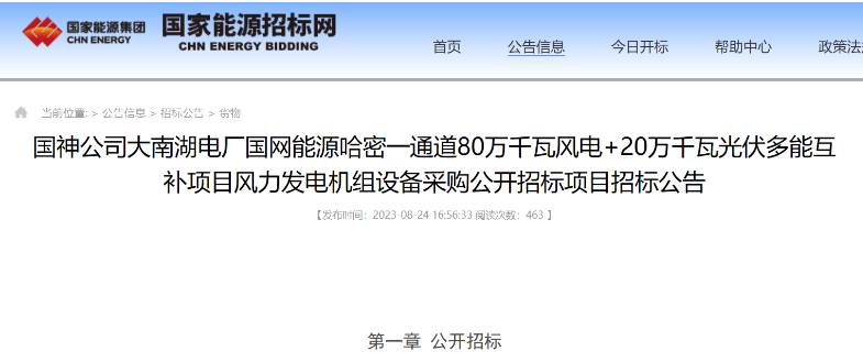 公告顯示,國(guó)網(wǎng)能源哈密一通道80萬(wàn)千瓦風(fēng)電+20萬(wàn)千瓦光伏多能互補(bǔ)項(xiàng)目場(chǎng)址位于新疆哈密大南湖地區(qū),工程場(chǎng)址中心距哈密市直線(xiàn)距離約96km,呈不規(guī)則多邊形,占地面積約165.05km²,風(fēng)電場(chǎng)擬安裝128臺(tái)6.25MW風(fēng)力發(fā)電機(jī)組,總裝機(jī)容量800MW,共分為兩個(gè)標(biāo)段:A標(biāo)段400MW,B標(biāo)段400MW。本項(xiàng)目計(jì)劃于2023年9月30日前開(kāi)工(暫定);2024年6月30日前全容量并網(wǎng)發(fā)電。(暫定)