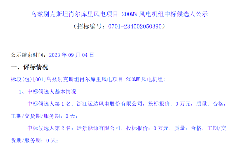 公告顯示,第一中標(biāo)候選人:浙江運(yùn)達(dá)風(fēng)電股份有限公司。第二中標(biāo)候選人:遠(yuǎn)景能源有限公司。第三中標(biāo)候選人:中車(chē)株洲電力機(jī)車(chē)研究所有限公司。