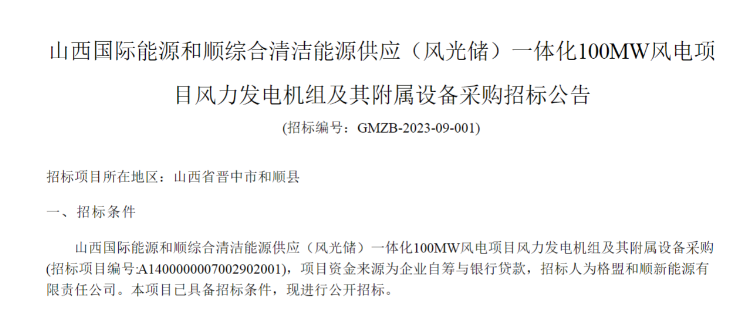 公告顯示,該項(xiàng)目位于山西省晉中市和順縣,總裝機(jī)容量為100MW,擬安裝16臺(tái)風(fēng)電機(jī)組。