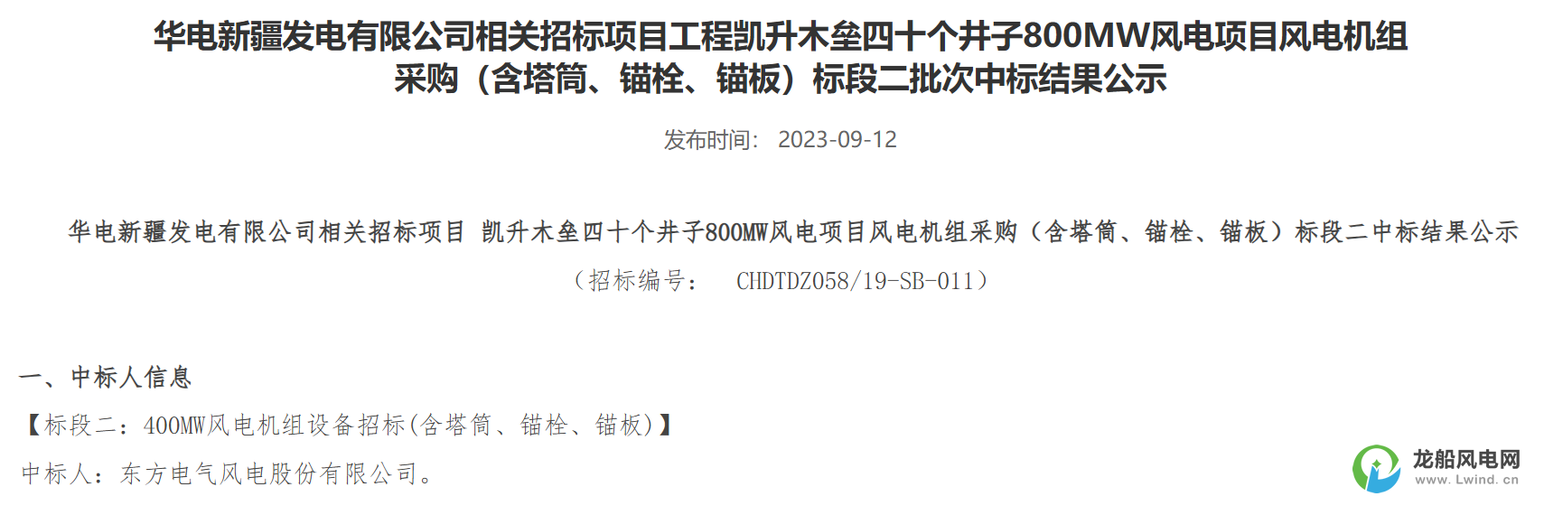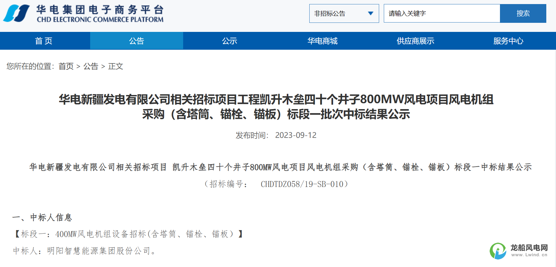 9月12日,華電集團(tuán)電子商務(wù)平臺發(fā)布華電新疆發(fā)電有限公司相關(guān)招標(biāo)項(xiàng)目凱升木壘四十個井子800MW風(fēng)電項(xiàng)目風(fēng)電機(jī)組采購(含塔筒、錨栓、錨板)標(biāo)段一、標(biāo)段二中標(biāo)結(jié)果公示的公告。