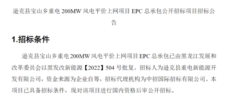 公告顯示,遜克縣寶山鄉(xiāng)重電200MW風(fēng)電平價上網(wǎng)項(xiàng)目位于黑龍江省黑河市遜克縣寶山鄉(xiāng)境內(nèi),場址中心距遜克縣城直線距離約50km,規(guī)劃裝機(jī)總?cè)萘繛?00MW,一次性建設(shè)完成,風(fēng)電場擬安裝32臺H193-6.25MW機(jī)型。