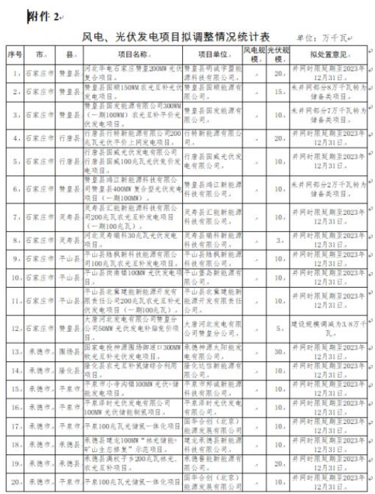 4月18日,河北省發(fā)改委對(duì)2022年到期風(fēng)電、光伏發(fā)電項(xiàng)目擬調(diào)整情況進(jìn)行公示。公示表示,為進(jìn)一步加強(qiáng)風(fēng)電、光伏發(fā)電項(xiàng)目管理,對(duì)2022年底已到期風(fēng)電、光伏發(fā)電項(xiàng)目建設(shè)進(jìn)度進(jìn)行了摸底統(tǒng)計(jì),并對(duì)逾期未建成項(xiàng)目提出了處置意見。其中,擬取消8個(gè)風(fēng)電、光伏發(fā)電項(xiàng)目,規(guī)模合計(jì)388MW;風(fēng)電、光伏發(fā)電項(xiàng)目擬調(diào)整37個(gè),規(guī)模合計(jì)4484MW,其中,光伏項(xiàng)目3816MW。