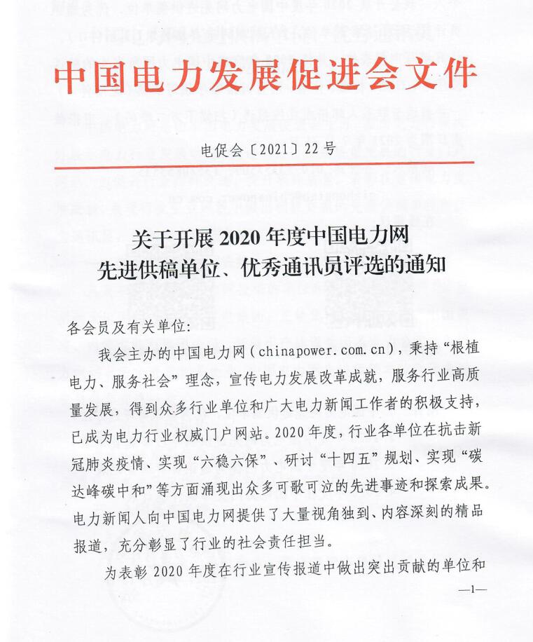 關(guān)于開展“中國電力網(wǎng)2020年度先進(jìn)供稿單位、優(yōu)秀通訊員”評選活動的通知