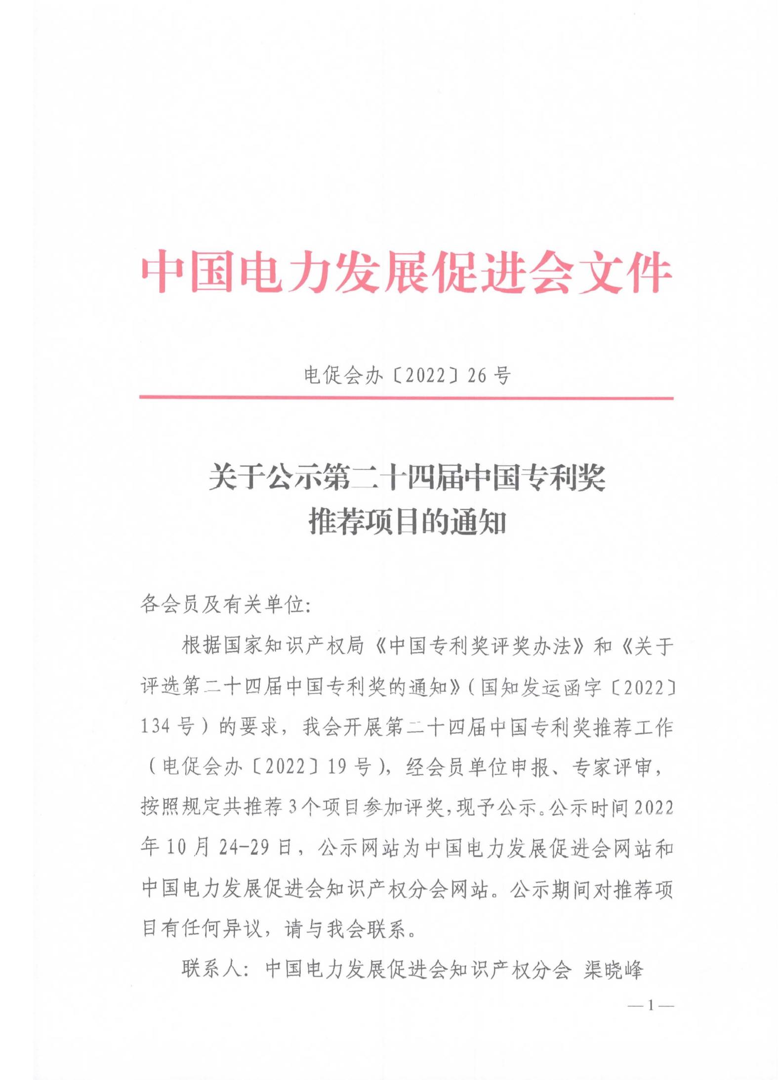 關(guān)于公示第二十四屆中國(guó)專利獎(jiǎng)推薦項(xiàng)目的通知