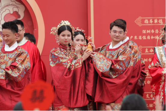 當(dāng)天,他們一同來到集體婚禮現(xiàn)場。卻扇禮、沃盥禮、合巹禮,一個個頗具儀式感的環(huán)節(jié)之后,新人們解纓結(jié)發(fā),交換信物,執(zhí)手誥天。光明區(qū)民政局黨開穎主任為現(xiàn)場新人證婚并送上祝福。禮成后,觀禮的親朋們揮動喜扇,歡呼喝彩,為新人們送上熱烈的祝福。