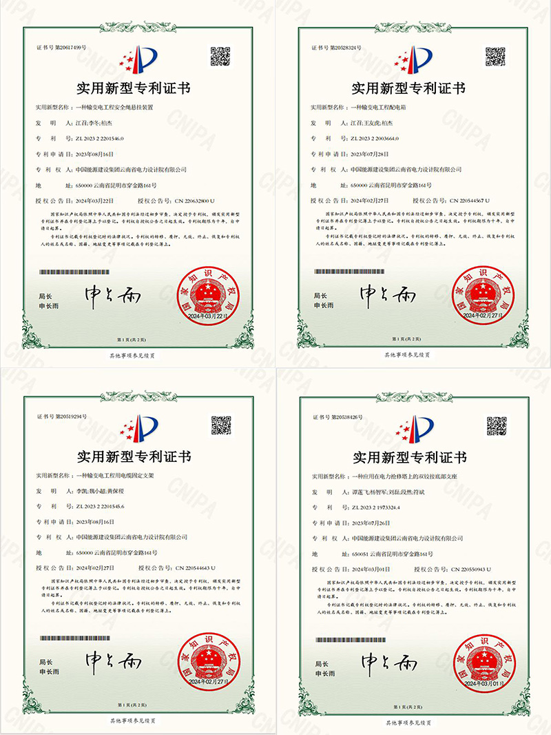 近日,由中國能建中電工程云南院獨(dú)立研發(fā)的“一種輸變電工程配電箱”“一種應(yīng)用在電力搶修塔上的雙鉸接底部支座”“一種輸變電工程用電纜固定支架”“一種輸變電工程安全繩懸掛裝置”四項(xiàng)成果獲得國家實(shí)用新型專利。