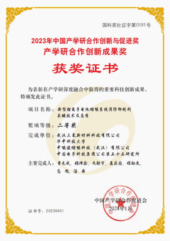 近日,第十五屆中國產(chǎn)學研合作創(chuàng)新大會在北京舉行。中能建儲能科技(武漢)有限公司與武漢三氟新材料科技有限公司、華中科技大學、中國電子科技集團公司第五十五研究所等單位合作的“新型鋰離子電池儲能系統(tǒng)消防抑制劑關鍵技術及應用”榮獲2023年中國產(chǎn)學研合作創(chuàng)新與促進獎–產(chǎn)學研合作創(chuàng)新成果獎二等獎。