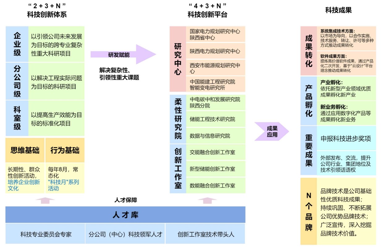 統(tǒng)籌搭建科技創(chuàng)新平臺。以“助推市場開發(fā)、加速業(yè)務(wù)轉(zhuǎn)型、孵化新型業(yè)務(wù)”為導(dǎo)向,聚焦關(guān)鍵核心技術(shù)攻關(guān),整合匯聚內(nèi)外部資源,搭建了“4+3+N”科技創(chuàng)新平臺,即“國家電力規(guī)劃研究中心陜西省中心”“陜西省電力規(guī)劃研究中心”“西安市能源規(guī)劃研究中心”“中國能建智能變電技術(shù)研究所”4個外部科技創(chuàng)新平臺;“中電碳中和發(fā)展研究院陜西分院”“儲能工程技術(shù)研究院”“數(shù)據(jù)與信息研究院”3個柔性組織研究院;“交能融合創(chuàng)新工作室”“新型儲能創(chuàng)新工作室”“數(shù)能融合創(chuàng)新工作室”等N個創(chuàng)新工作室。“4+3+N”科技創(chuàng)新平臺建設(shè)優(yōu)化了科技創(chuàng)新資源配置,提升了關(guān)鍵核心技術(shù)攻關(guān)能力,推動了科技成果轉(zhuǎn)化孵化,促進(jìn)了陜西院科技創(chuàng)新能力快速提升。