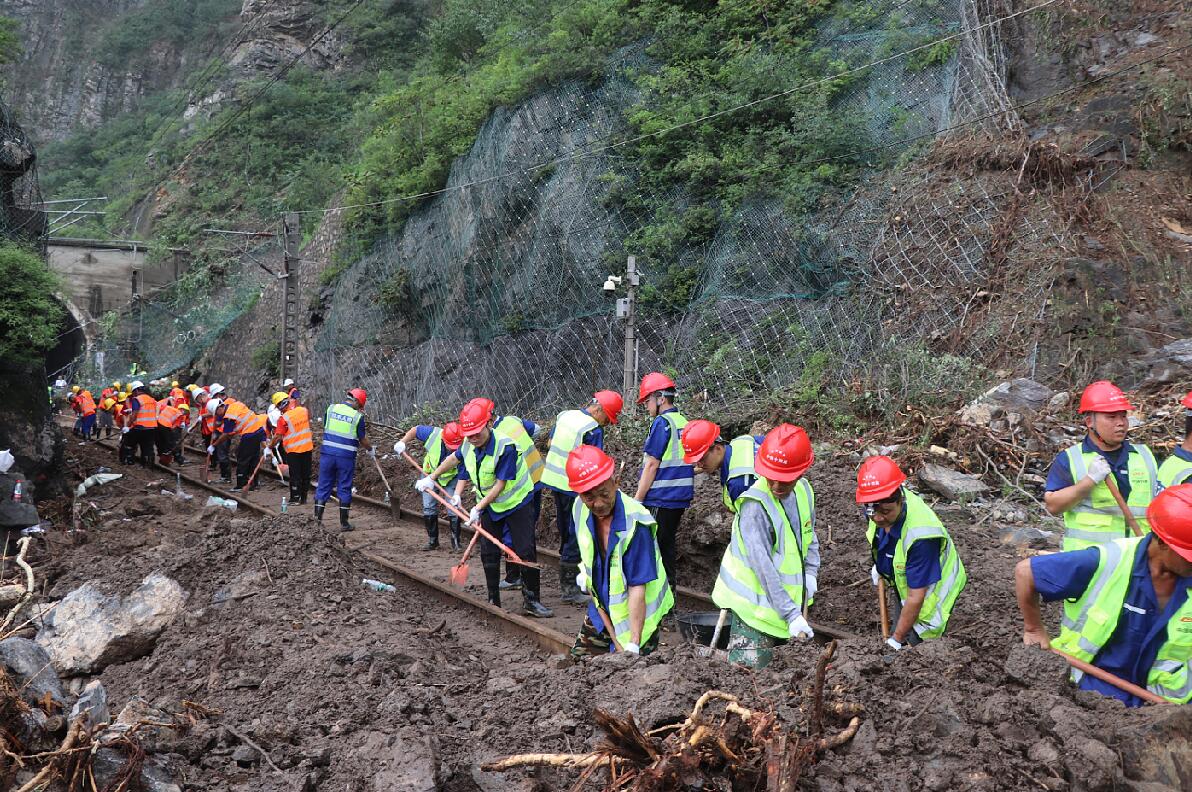 7月30日,受北京特大暴雨影響,三輛列車受困??吭诒本╅T頭溝妙峰山鎮(zhèn)山區(qū)。由于交通完全阻隔,災(zāi)情仍在持續(xù),現(xiàn)場救援刻不容緩。8月1日晚上9點(diǎn)半,接上級通知,中鐵十四局京唐、石港、雄商、雄忻、津滄等北京周邊項目共275人連夜趕赴北京門頭溝搶險一線,搶修被山體沖刷的淤泥、樹根、巨石覆蓋的鐵路路基,為受困列車旅客拉通逃生通道。