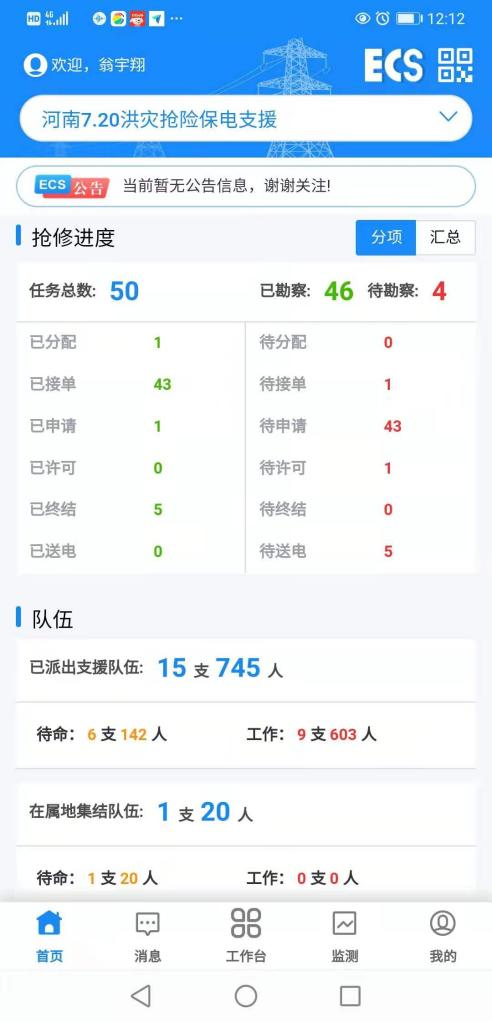 ECS系統(tǒng)及閩電應急app曾在防抗2020年第6號臺風“米克拉”、2019年第11號臺風“白鹿”等事件中出色完成國網(wǎng)福建電力抗臺保電任務,作為應急管理系統(tǒng)的一名“老手”,ECS系統(tǒng)及閩電應急app在河南電網(wǎng)搶修這個“新戰(zhàn)場”完成了優(yōu)化升級,在短短兩天內針對河南現(xiàn)場搶修特點上線新模塊,模塊支持跨省隊伍調派、任務單下發(fā)、現(xiàn)場信息勘察及回傳、物資需求提報以及搶修信息統(tǒng)計等功能。