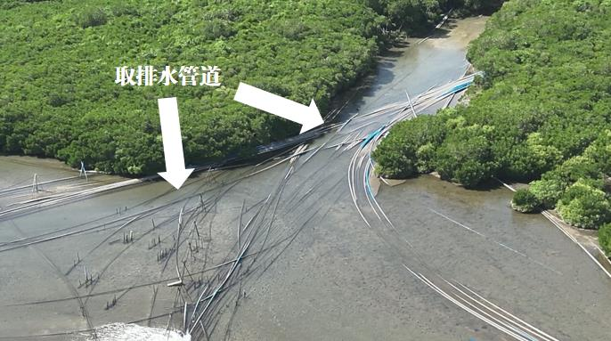 ▲圖5 2023年11月22日,督察組現(xiàn)場(chǎng)督察使用無人機(jī)拍攝,養(yǎng)殖塘取排水設(shè)施穿越清瀾紅樹林省級(jí)自然保護(hù)區(qū)核心區(qū)