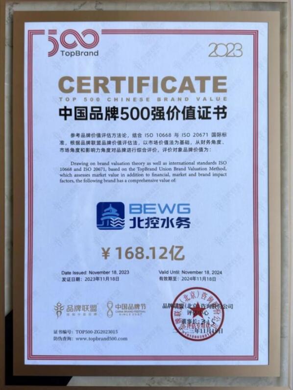 11月18日,2023第十七屆中國(guó)品牌節(jié)在杭州舉行。品牌聯(lián)盟(Topbrand Union)發(fā)布了《TopBrand 2023 中國(guó)品牌500強(qiáng)》榜單。北控水務(wù)獲中國(guó)品牌500強(qiáng)榮譽(yù)稱號(hào),品牌價(jià)值達(dá)到168.12億元,這是北控水務(wù)連續(xù)兩年入選該榜單。