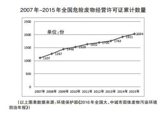 環(huán)境保護部近日公布的《2016年全國大、中城市固體廢物污染環(huán)境防治年報》(以下簡稱《2016年報》)顯示,全國危險廢物處理能力明顯提高,截至2015年底,各省(區(qū)、市)累計頒發(fā)的危險廢物(含醫(yī)療廢物)經(jīng)營許可證共2034份,比2014年增加113份,全國危險廢物經(jīng)營單位核準危廢處理能力達5263萬噸/年,較同期提高959萬噸/年。